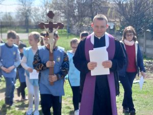 A héten nagyböjti keresztúton vettek részt iskolánk tanulói és pedagógusai is Ft. Palotai Ádám atya vezetésével.